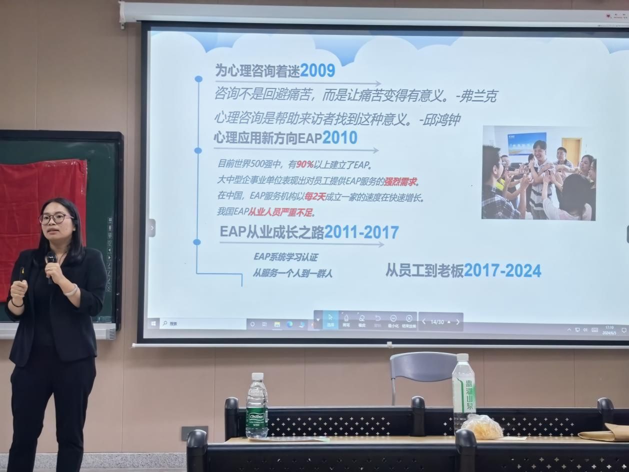 讲座开始,王艳虹以香道、茶艺等自己的兴趣爱好为切入点,说明中国传统文化相关产业的发展前景十分广阔。接着,王艳虹指出“科学认识自己是活力心态的第一步”,引导在场员工通过MBTI职业性格测试进行自我分析,帮助大家深入了解自己,从而去寻找适合自己的职业道路。王艳虹讲述了自己的职业成长故事,秉承着EAP(员工心理援助计划)“助人自助”的理念,她从实习生开始,认真负责、踏实上进,通过自己的不懈努力一步步成为公司合伙人,并带领广州市恒缘健康信息科技有限公司做到“五年有团队、十年有规模”,目前已成功跻身国家高新技术企业行列。
